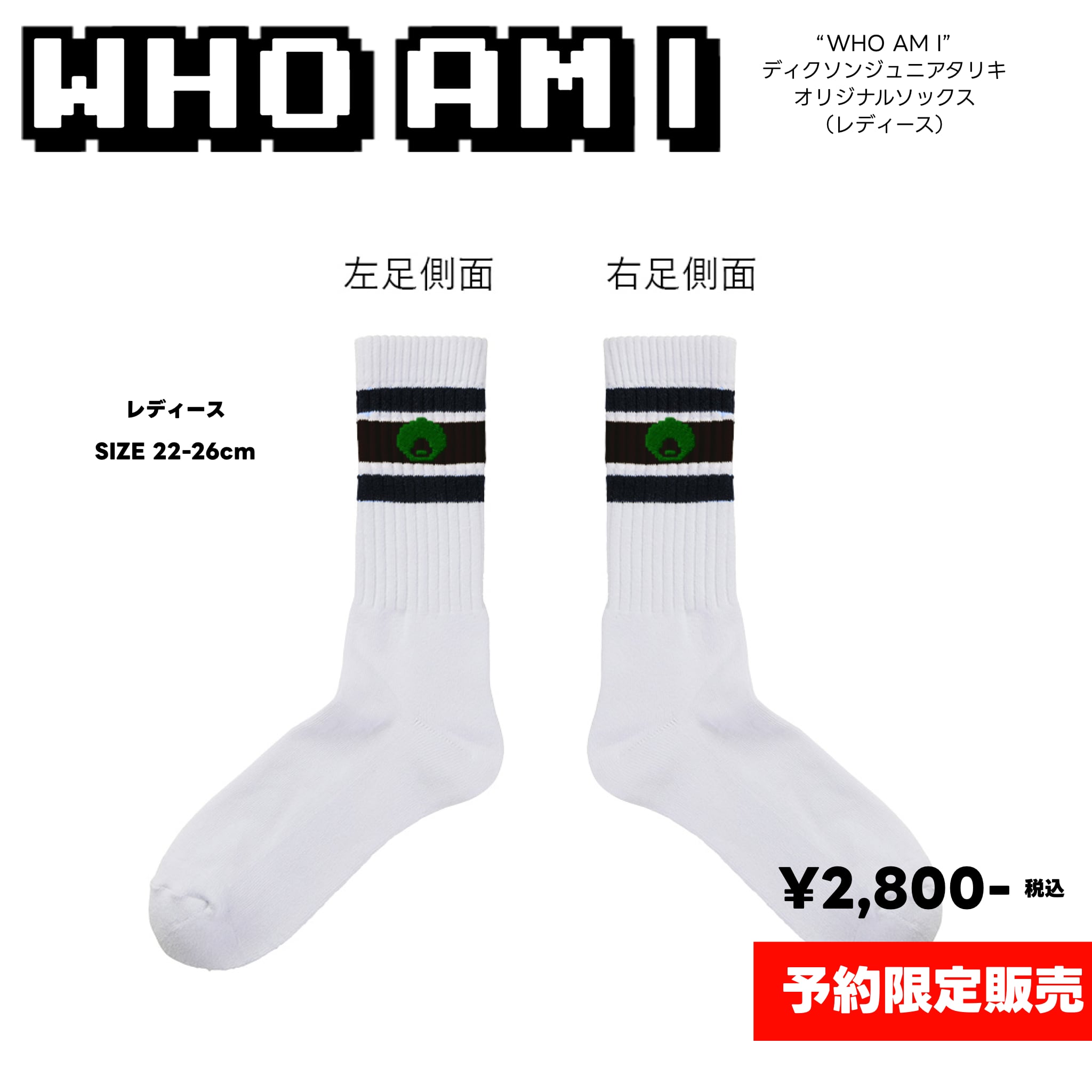 ディクソン・ジュニア・タリキのオリジナルブランド『WHO AM I』のロゴをワンポイントで刺繍した、オリジナルソックス。