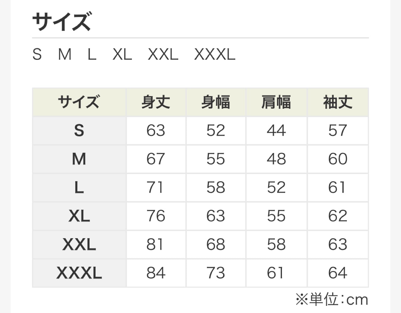 S、M、L、XL、XXL、XXXL